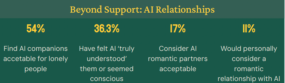 As public adoption matures, a significant portion of the global population is beginning to outsource emotional regulation and social connection to AI. 54% find AI companions acceptable for lonely people; 36.3% have felt that an AI truly understood their emotions or seemed conscious; 17% consider AI romantic partners acceptable; 11% would personally consider a romantic relationship with an AI. As these early adopters normalize the behavior, we should expect a cultural battle over the definition of authentic intimacy, similar to past shifts in online dating norms.