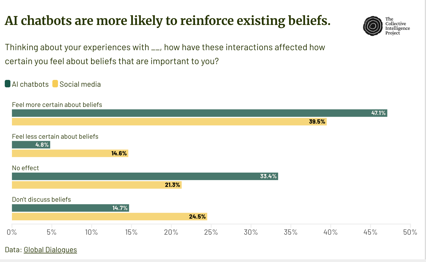 AI is reinforcing beliefs more powerfully than social media. 44.5% of people report feeling more certain about beliefs after interacting with AI while only 4.8% less certain. AI is three times less likely to cause doubt than social media. One in seven individuals report having a friend that shows reality-distorting experiences from using AI.