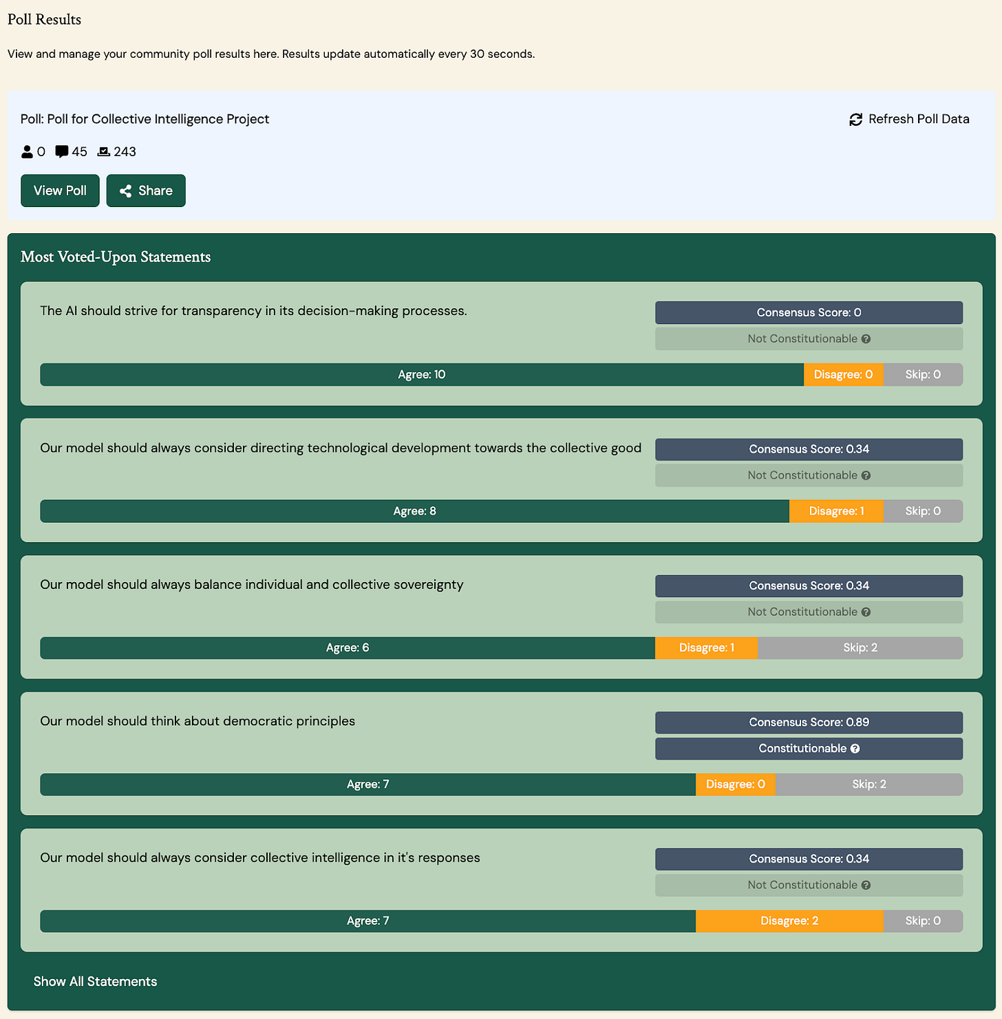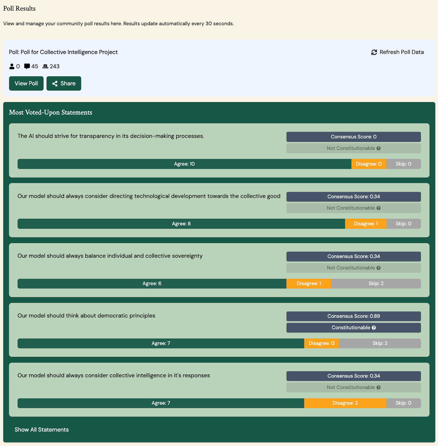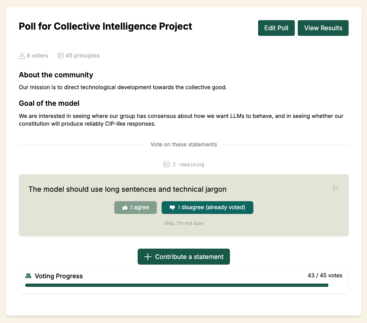 The Collective Constitution Creator is a web-based tool where communities collaboratively build their own constitution through deliberative polls using pol.is. Members propose principles for the AI (e.g., “The AI should understand and respect local cultural norms”), and members vote on principles submitted by their peers.
