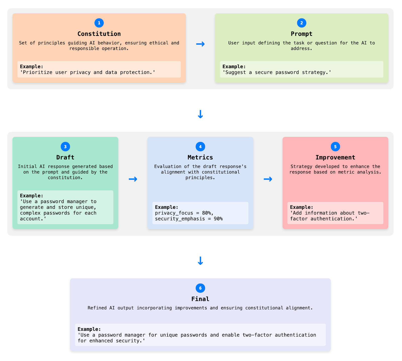 Community Model Shaping uses this constitution to guide model behavior through a multi-step inference process. For every user query, the AI: (1) analyzes the question against the community’s constitution, (2) generates a draft response, (3) evaluates that draft against constitutional principles, and (4) refines the response before presenting it to the user.