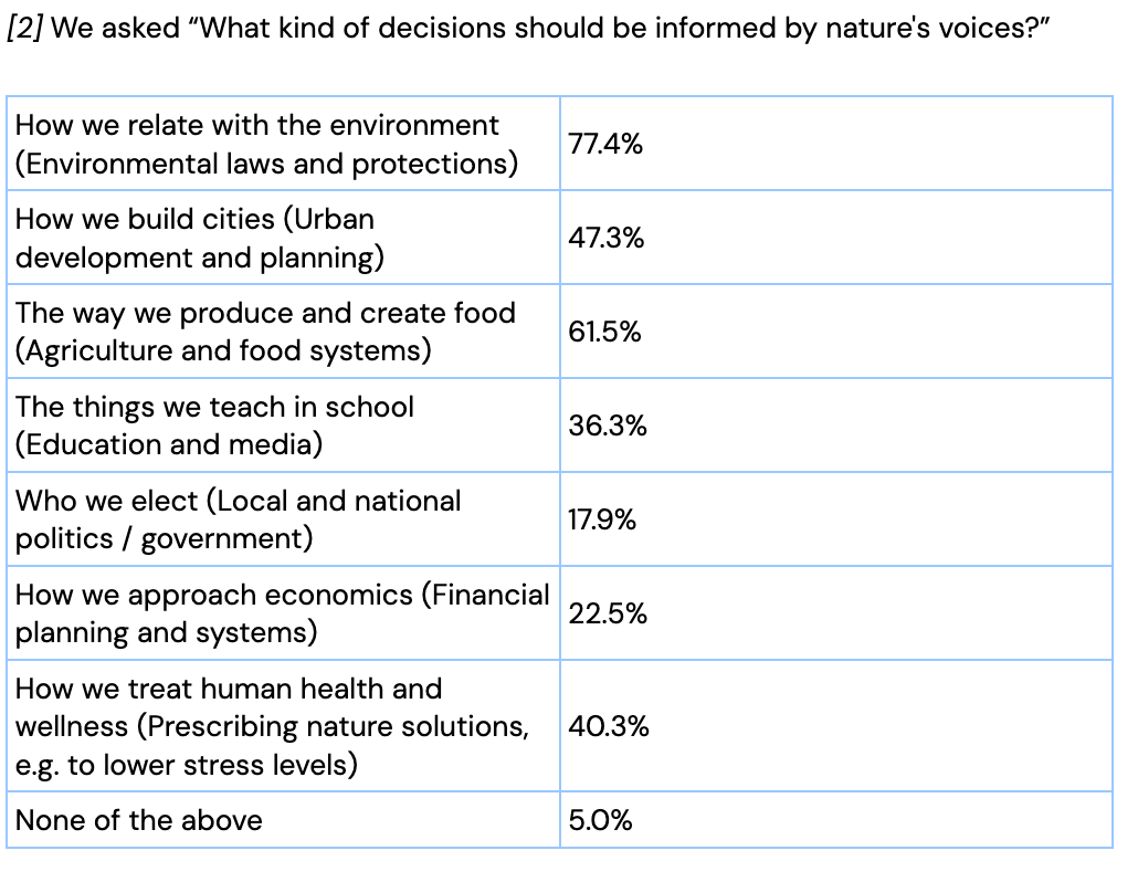 79.2% of the global public finds this vision of AI systems integrating human and non-human data for community decisions at least somewhat or very appealing.1 We also asked “What kind of decisions should be informed by nature’s voices?” and 77.4% think environmental laws and protections should be informed by input from nature (Agriculture and food systems: 61.5%, Urban development and planning: 47.3%, Human health and wellness: 40.3%, Education and media: 36.3%) 2