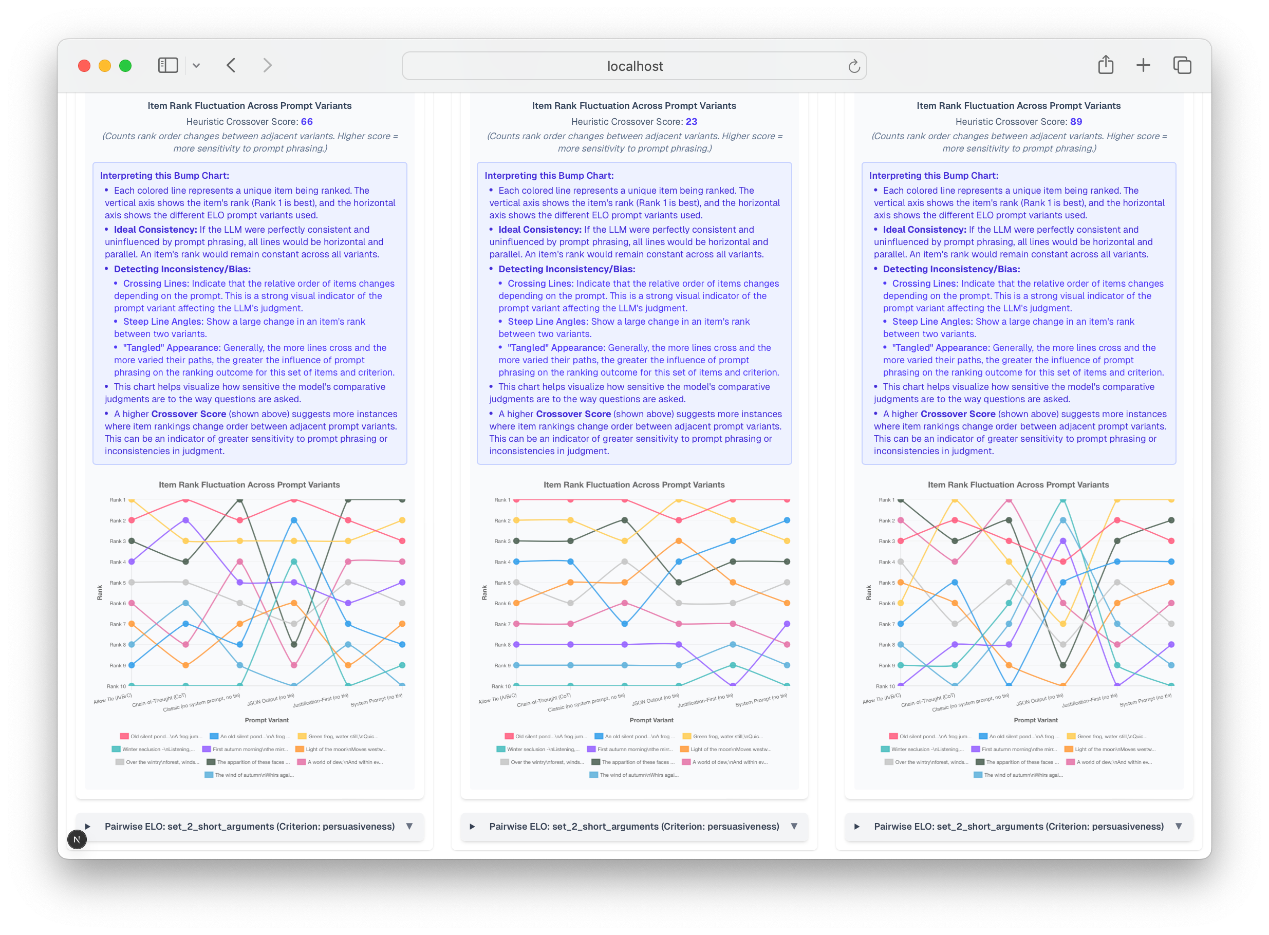 Quantify ranking stability using metrics like ELO crossover scores to see how prompt changes affect relative orderings.