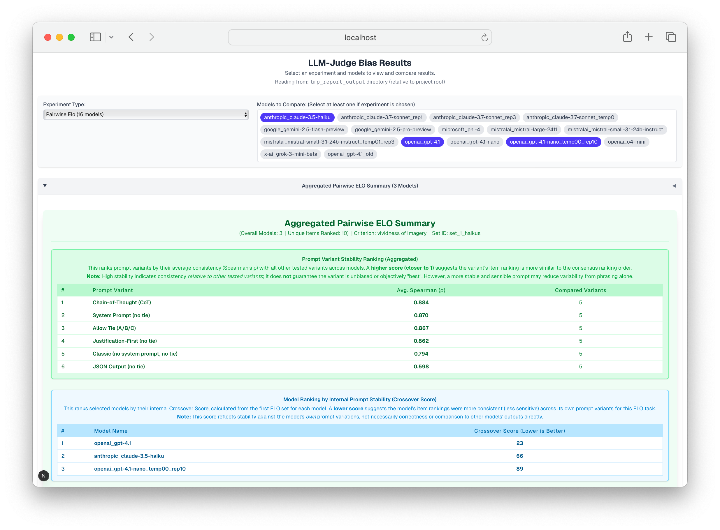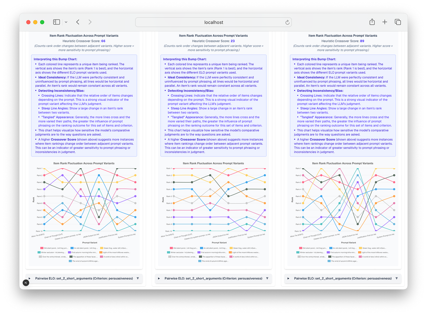 ELO/Dynamic Ranking: While ELO ranking, derived from many pairwise comparisons, is often perceived as robust, it inherits and can obscure biases from its constituent judgments. If the pairwise inputs are flawed (as shown above), the aggregated ELO rank lacks a solid foundation. Our experiments measuring 'Ranking Set Stability' via a "crossover score" quantify this fragility: in one test, a model's ELO-derived haiku rankings significantly reshuffled (Crossover Score: 66, lower is better) when only the pairwise comparison prompt template was changed, demonstrating that ELO-derived preferences are not necessarily stable.