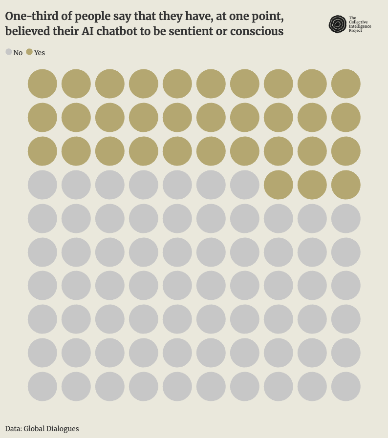 We are using our Global Dialogues infrastructure to identify what behavioral qualities of AI lead people to believe that it’s conscious. Relatedly, we are also exploring how prevalent early indicators of AI-induced reality distortion might be. We have seen that rates of perceived consciousness are increasing, and that cultural factors are a large determinant of that; this means discussions of moral welfare are quickly arriving. These discussions will be huge cultural flashpoints.