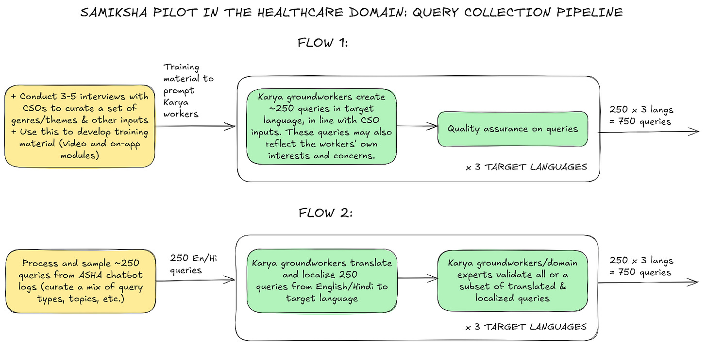 We began by consulting with a network of civil society organizations, each an expert in a given domain (such as healthcare, education, or agriculture). After conducting semi-structured interviews with each, we established key principles and sub-domains that indicated the types of prompts people within a given field may ask a chatbot. Using Karya’s vast network of data workers experienced with using their survey platform and familiar with local languages and culture, we built a larger dataset of queries, all informed by civil society input and lived experience.