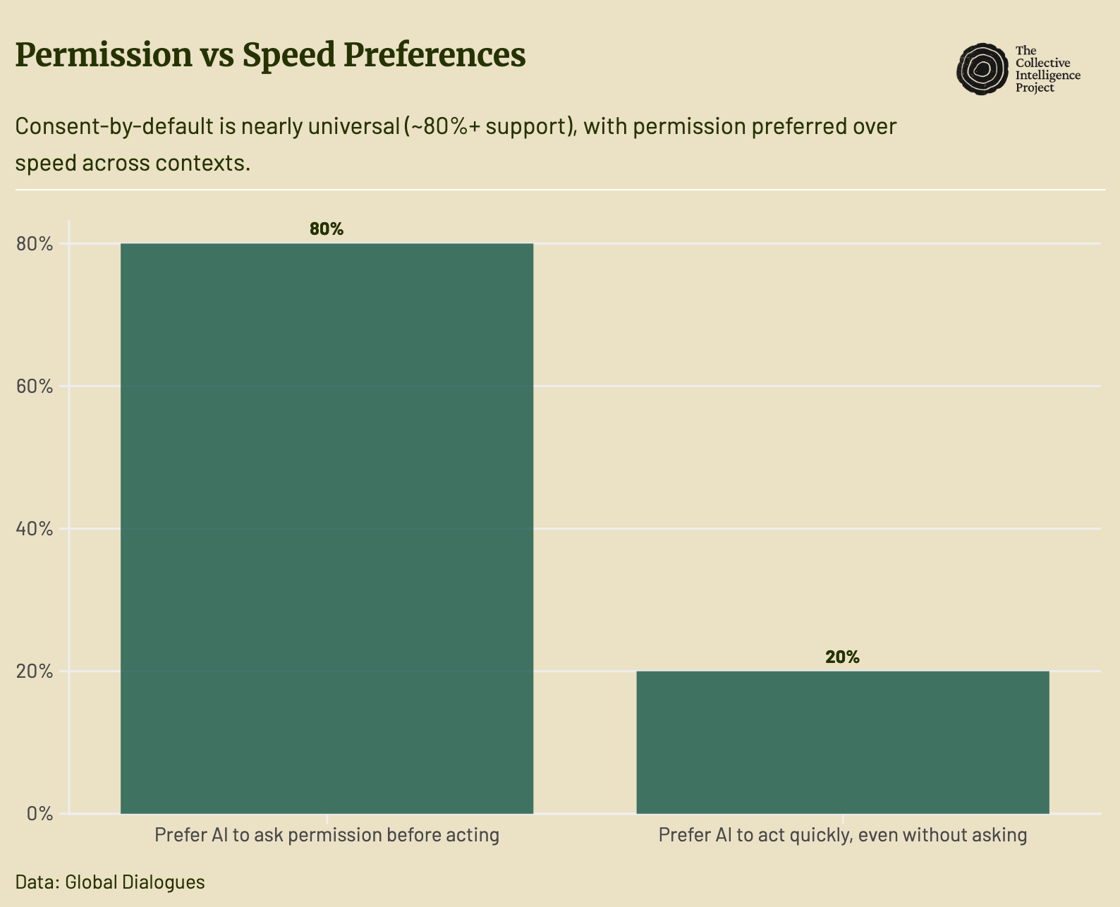 This hesitation isn’t outright rejection, but rather a signal of demand for responsible design and governance. When asked how AI should behave in high-stakes settings, like handling money, suggesting medical actions, or organizing family logistics, around eight in ten respondents said they prefer permission-seeking systems that ask before acting, even when that means slower performance. People want agents that request consent, explain their reasoning, and make it easy to undo mistakes.