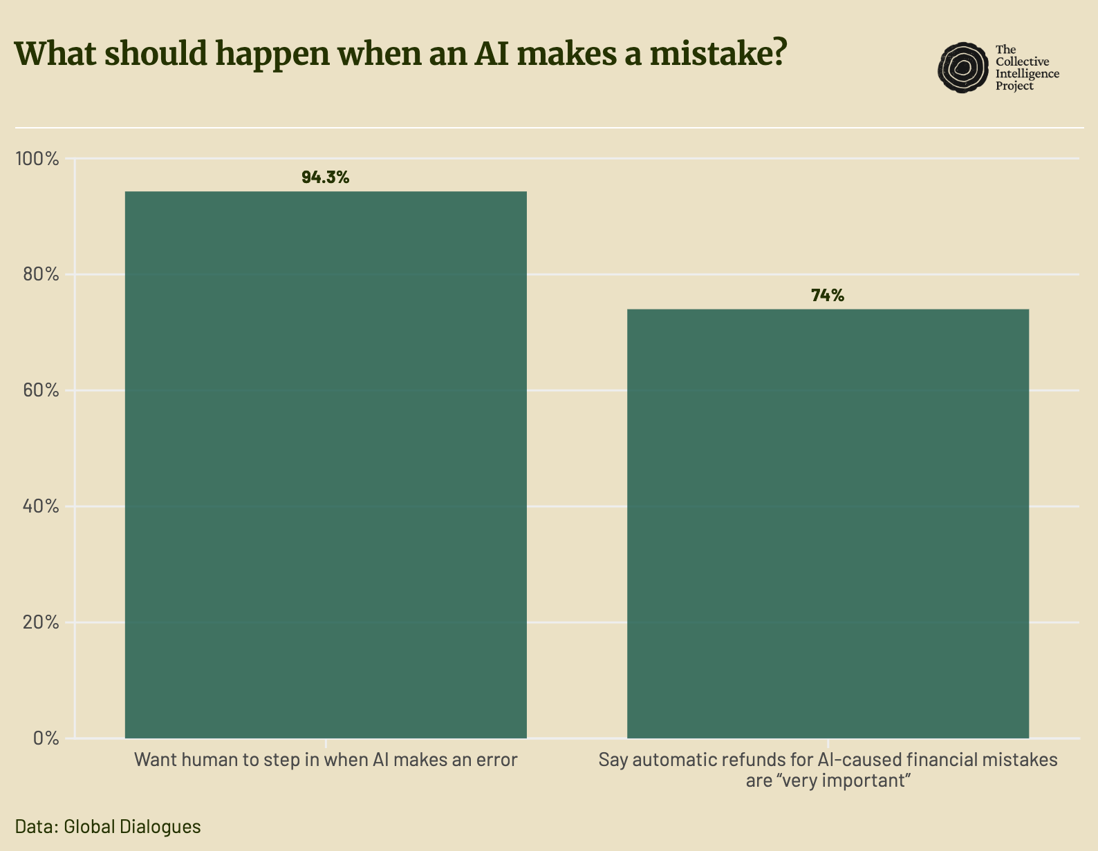 The expectation of human backup is nearly universal. Ninety-four percent of daily work users want a person to step in when AI makes an error, and three-quarters believe automatic refunds for AI-caused financial mistakes are very important. For most, trust doesn’t mean blind faith, but the ability to correct and recover.