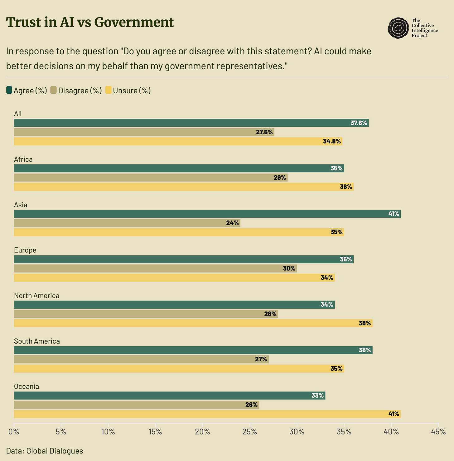 In Asia, participants report higher trust in AI companies, about one in three say they generally trust these firms, paired with lower confidence in government institutions. In Europe, the pattern reverses: trust leans toward public institutions and regulation, while confidence in tech companies lags. African and Middle Eastern respondents tend to show moderate trust in AI overall but a strong desire for human oversight. In North America, people are split, optimistic about innovation, skeptical about accountability. When asked if they thought AI could make better decisions on their behalf than their elected representatives, 38% of participants agreed.1