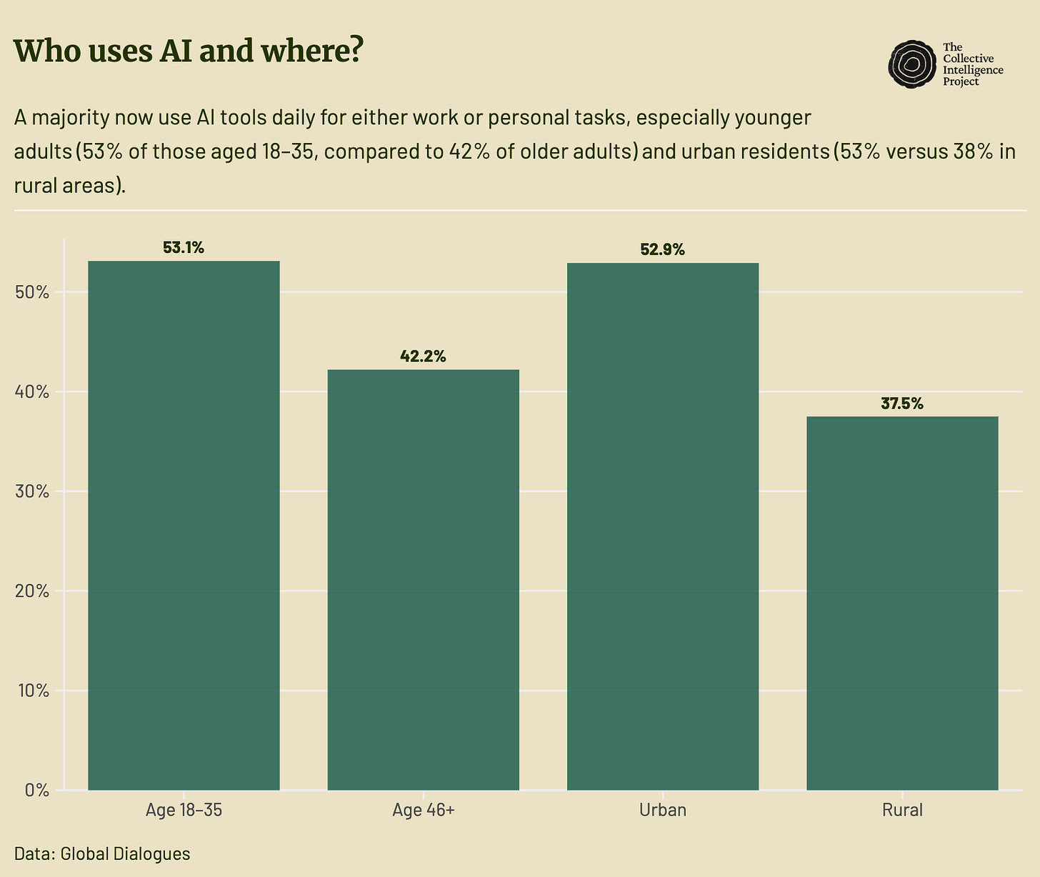 Across more than a thousand participants, we found that AI is already part of daily life, but people remain cautious about letting it take independent action on their behalf. A majority now use AI tools daily for either work or personal tasks, especially younger adults (53% of those aged 18–35, compared to 42% of older adults) and urban residents (53% versus 38% in rural areas). Yet very few, just over 5%, have used AI for civic or community organizing, and financial delegation remains nearly nonexistent.